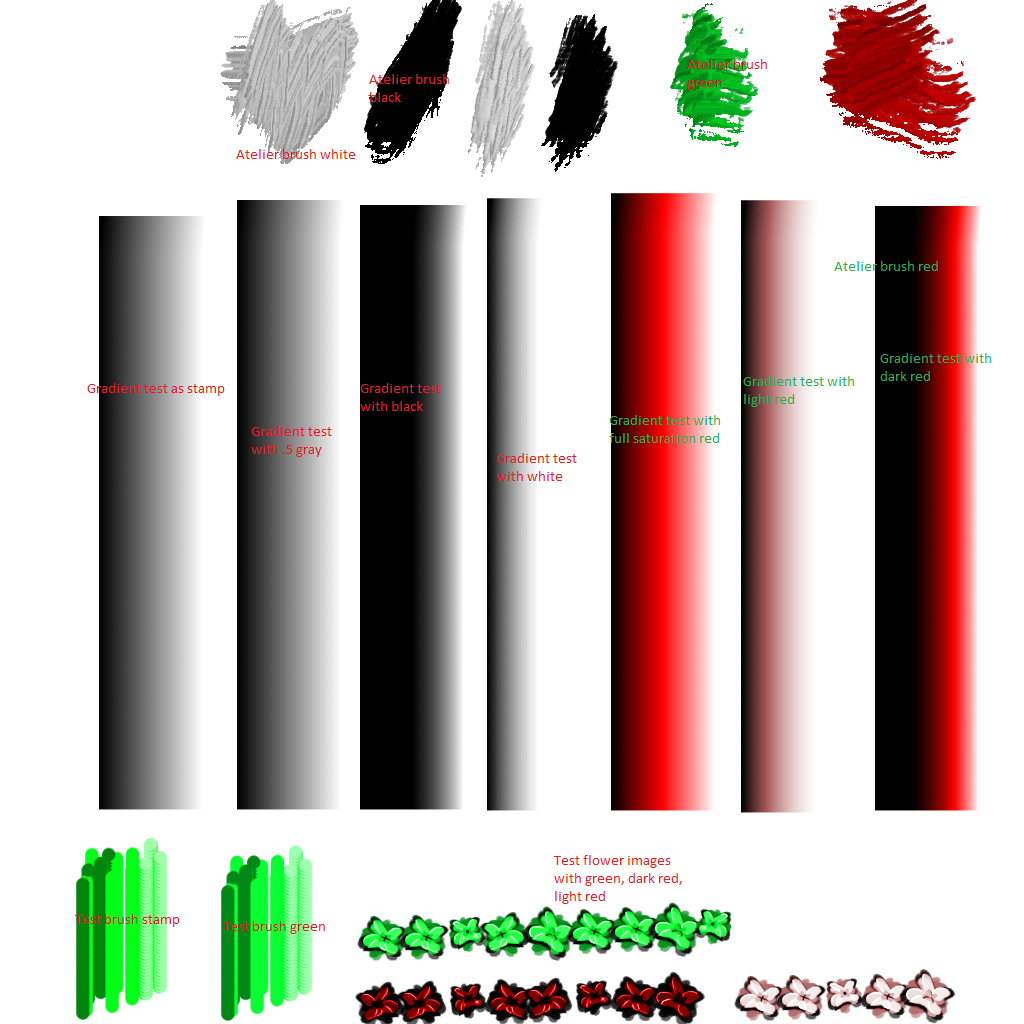Okay, finally got it to build (directory name was too long, stupid Windows limitation). Here is an image, again showing the perfect gradient brush on the left as direct image, and next to it the same brush with lightness turned on, and using .5 gray. They look identical, so I would say it’s about as perfect as can be. After that I have a simple image brush I made from color, again on the left is as the original image, and on the right is using the lightness setting and the primary color. Again they look identical, so I count that as a perfect success. On top I have the Atelier brushes, with the first two being black and white with the original (127) neutral point, and to the right of that, the same brush with a neutral point of 88. The neutral point change makes them look like they have the correct color of paint, rather than being too dark. At the bottom, I have some stamp brushes I made that show off both outlines and highlights, using colors and black and white. Everything looks exactly as they should, so I think this is the winner. At least, it’s exactly what I wanted when I set out to make this change.