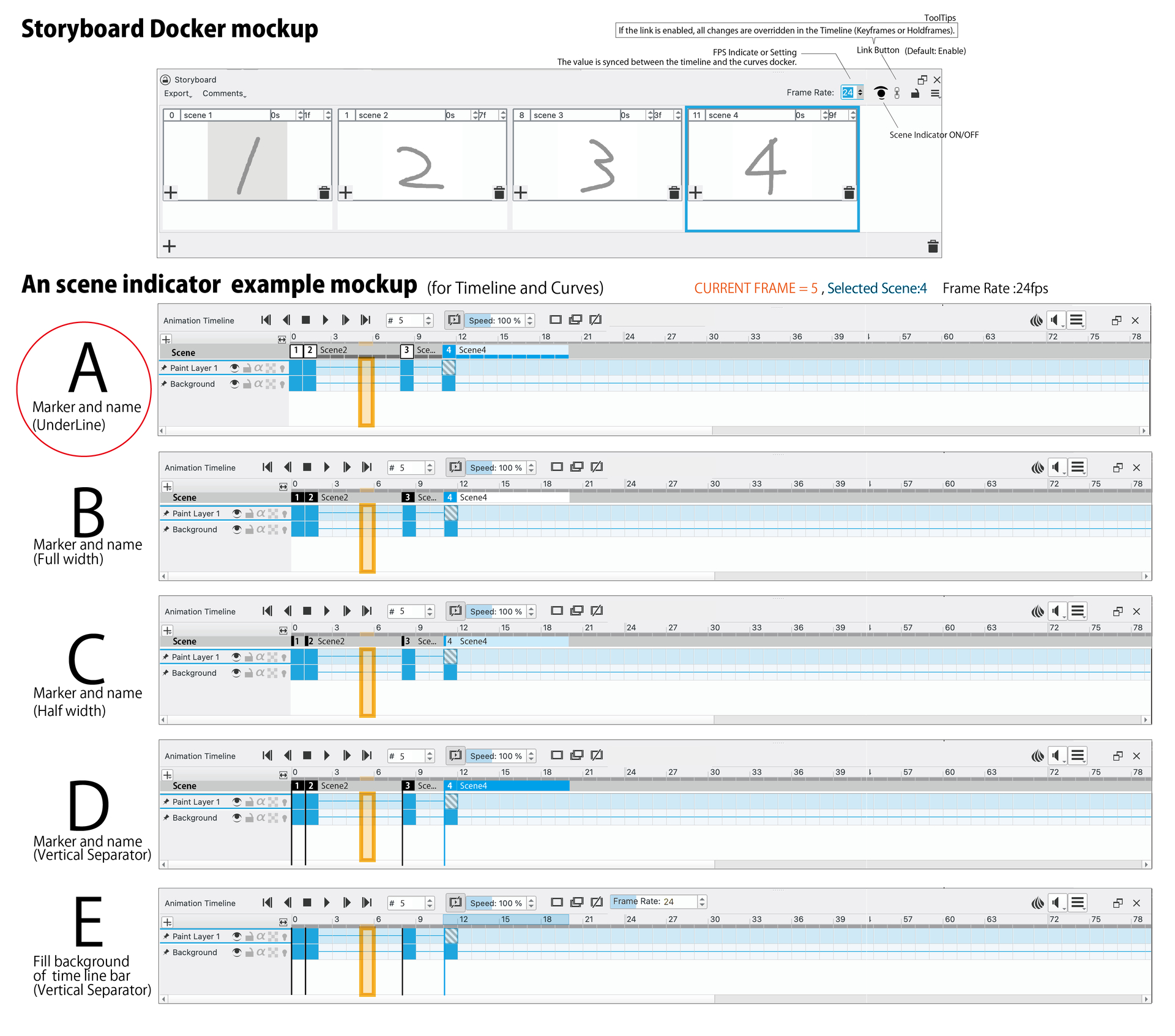 - Indicate of each scene range into Animation Timeline and Curves Docker.
