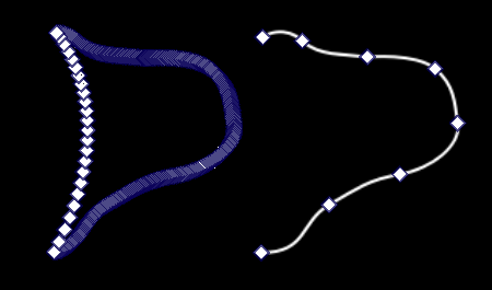 On the right is a line created using bezier curves. It only has 8 nodes and is easy to edit and tweak. On the left is the same shape after using a subtractlogical operation with another line. Now there are so many nodes it’s essentially uneditable.