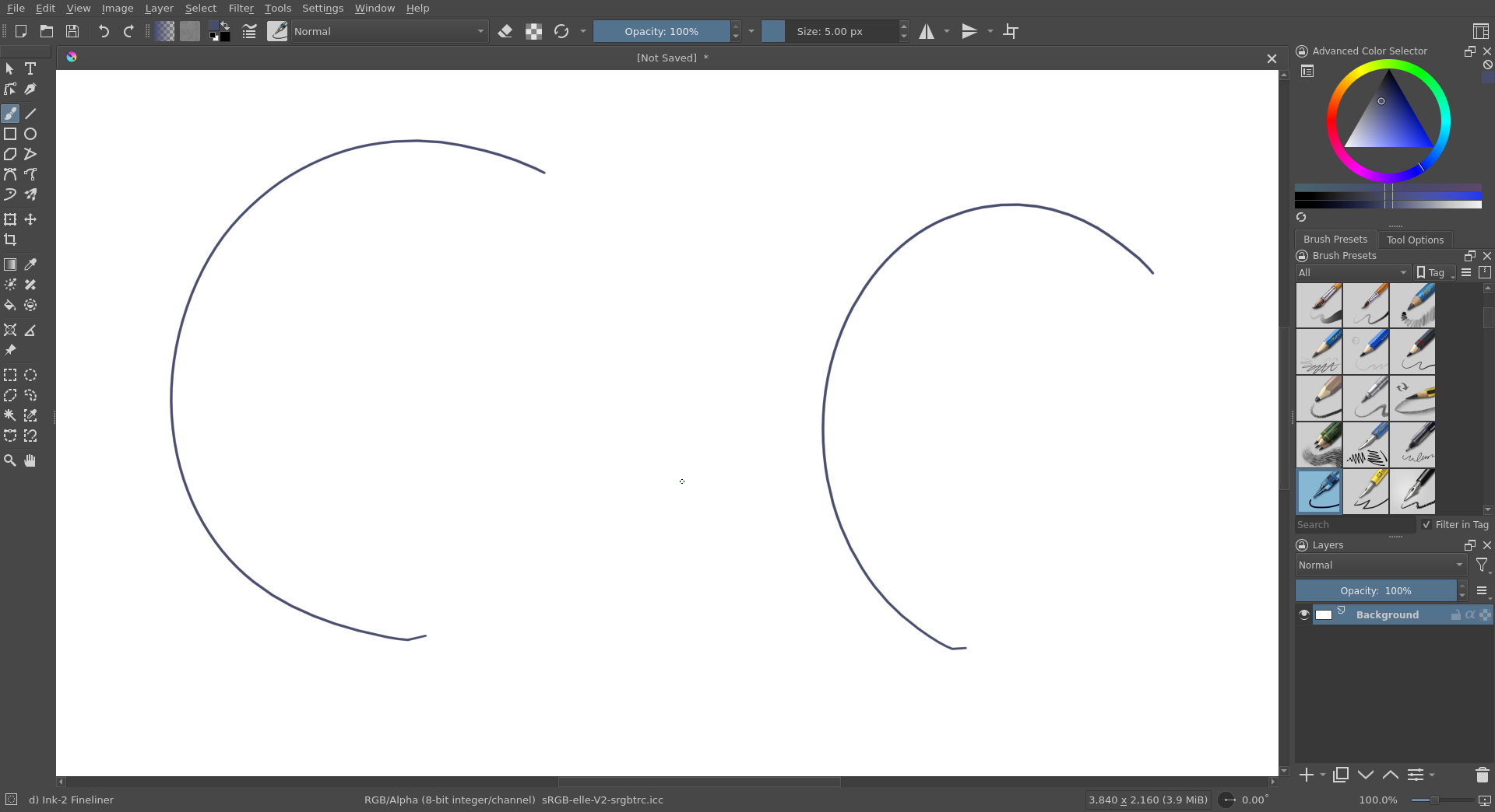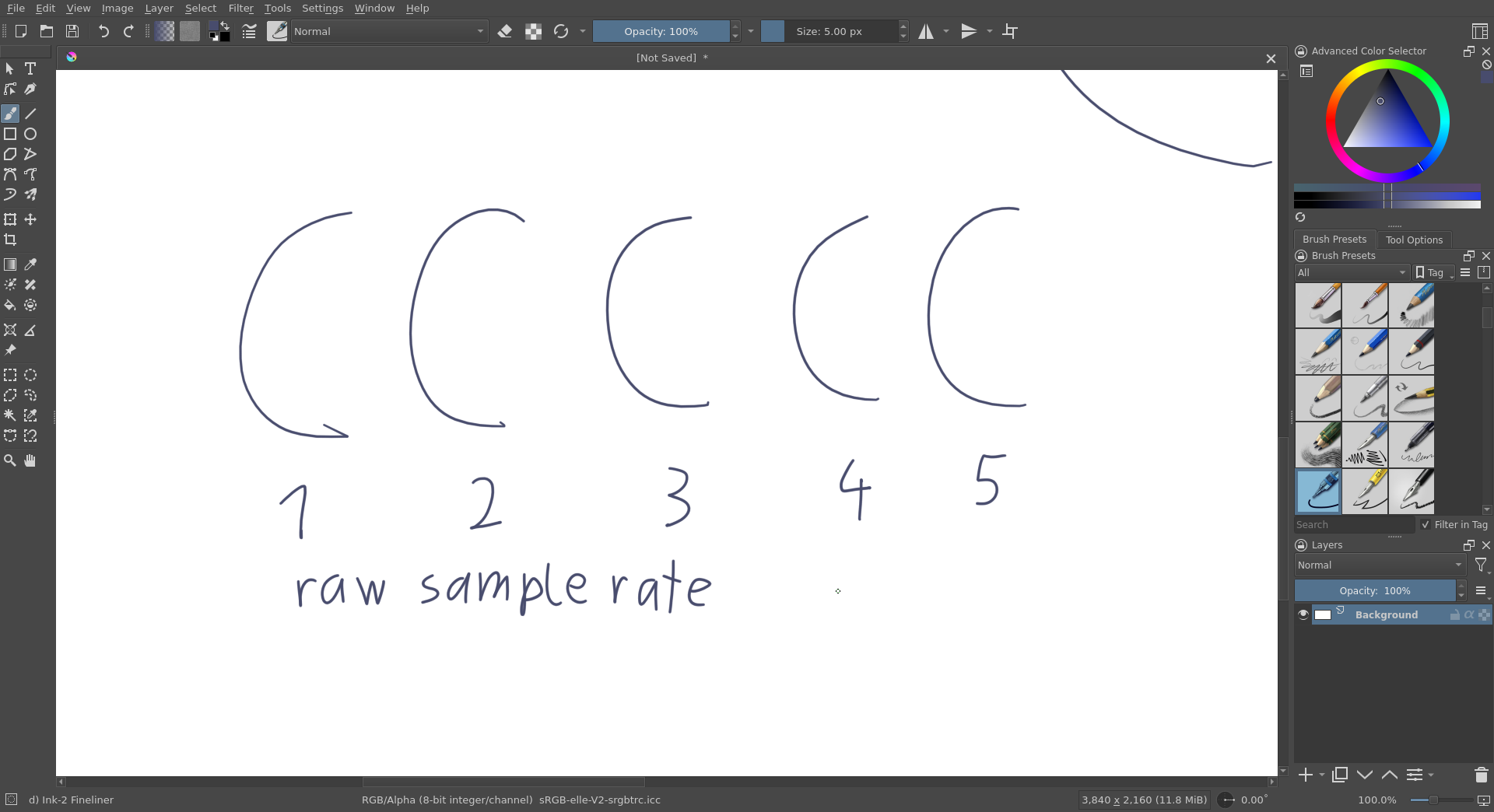 The xf86-input-wacom driver has two sliders in the KDE system settings. The second one didn’t seem to do anything, but the raw sample rate slider influences not only smoothing, latency and seemingly cutting off more from the end of the stroke. It’s set to 4 by default which results in the small straight end shown above. Setting it to 1 however turns the end into a bigger straight line going backwards, exactly as with OpenTabletDriver, so both of them seem to have the same issue, only that OpenTabletDriver doesn’t seem to have this slider to influence the bugged end. Increasing the value makes the straight end shorter and more aligned with the direction of the brush stroke, probably because of increased smoothing and ending the stroke earlier. I found that setting it to 6 makes the straight end pretty much unnoticeable in practice without increasing latency too much, so I could theoretically use this. Going back to X11 for this would be very unfortunate, mostly because I can somehow only run games well on Wayland (I have a Nvidia 1080), but I have another issue in Aseprite that only happens with xf86-input-wacom and OpenTabletDriver. The end of every stroke lags and only appears like a quarter of a second after ending the stroke. Maybe solving this straight line issue will also solve this Aseprite issue, otherwise I’ll report it to Aseprite. But for now, this also makes xf86-input-wacom with the slider set to 6 no real alternative to me.
