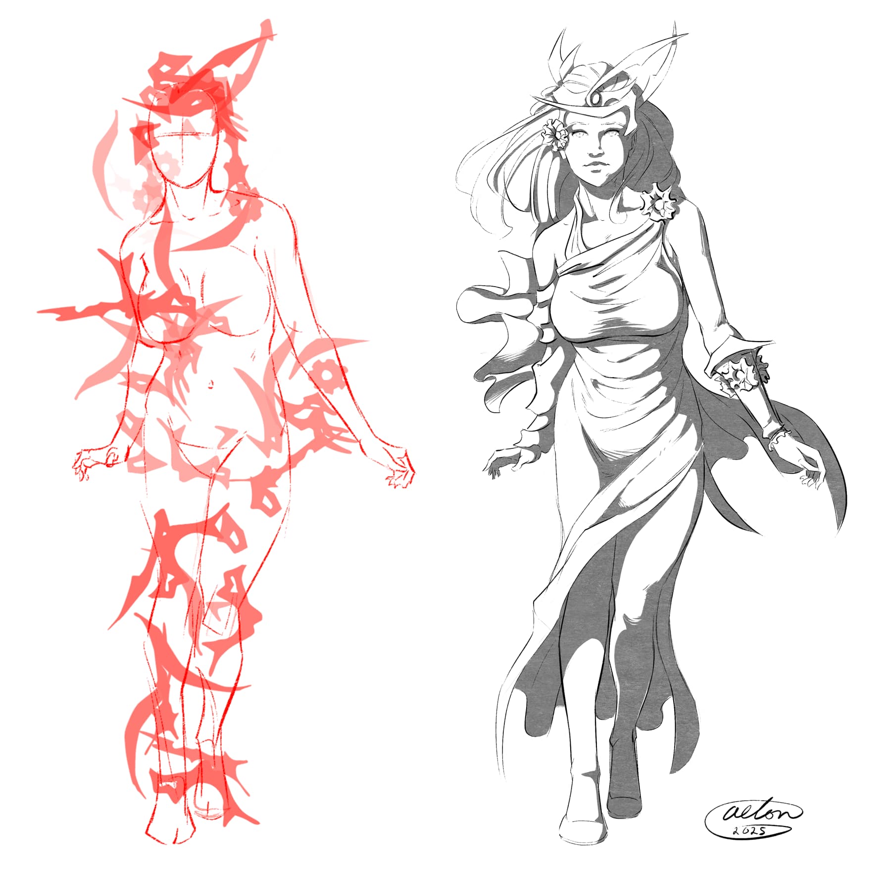 I’d take a drawing with strong shading, open it in Krita, and rotate the image 180 degrees. Then, I’d create a layer where I’d copy the contours. What’s this for? To make my lines looser when I trace/outline my own drawings.