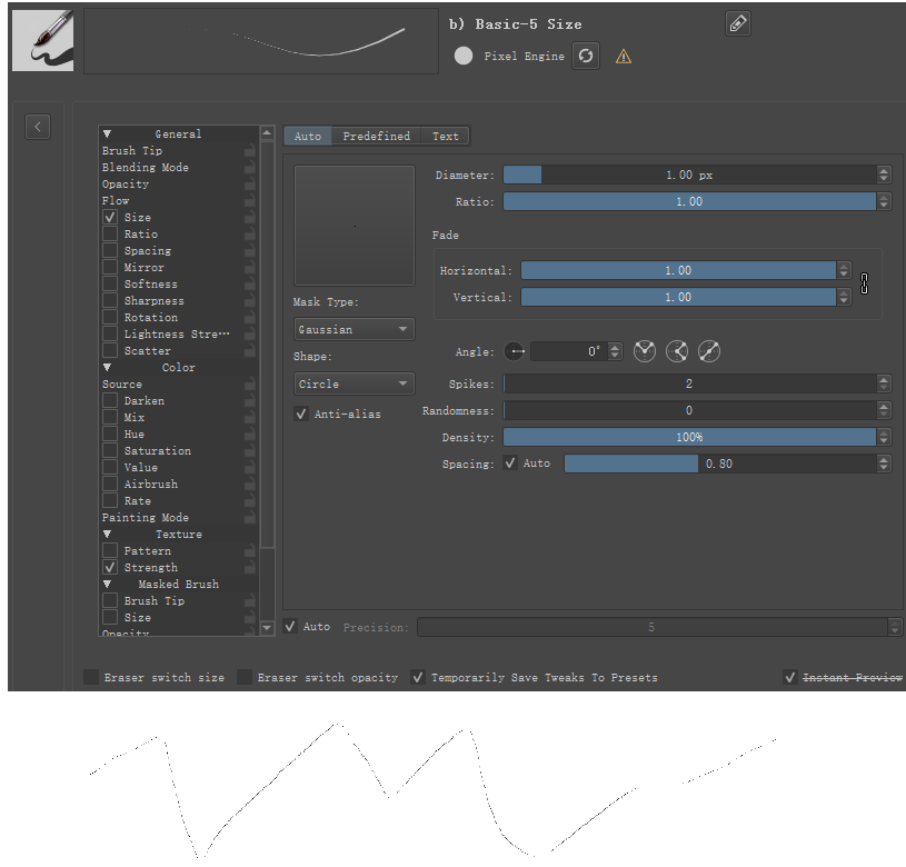 Take the Basic Flow brush and make sure to uncheck all dynamics (which means Flow and apparently Rotation). Open a new image 100x20 pixels. Put the size of the brush 0.8 px. You can use Line Tool since it’s easy, but using the Freehand Brush Tool in a similar way will show you the same issue.