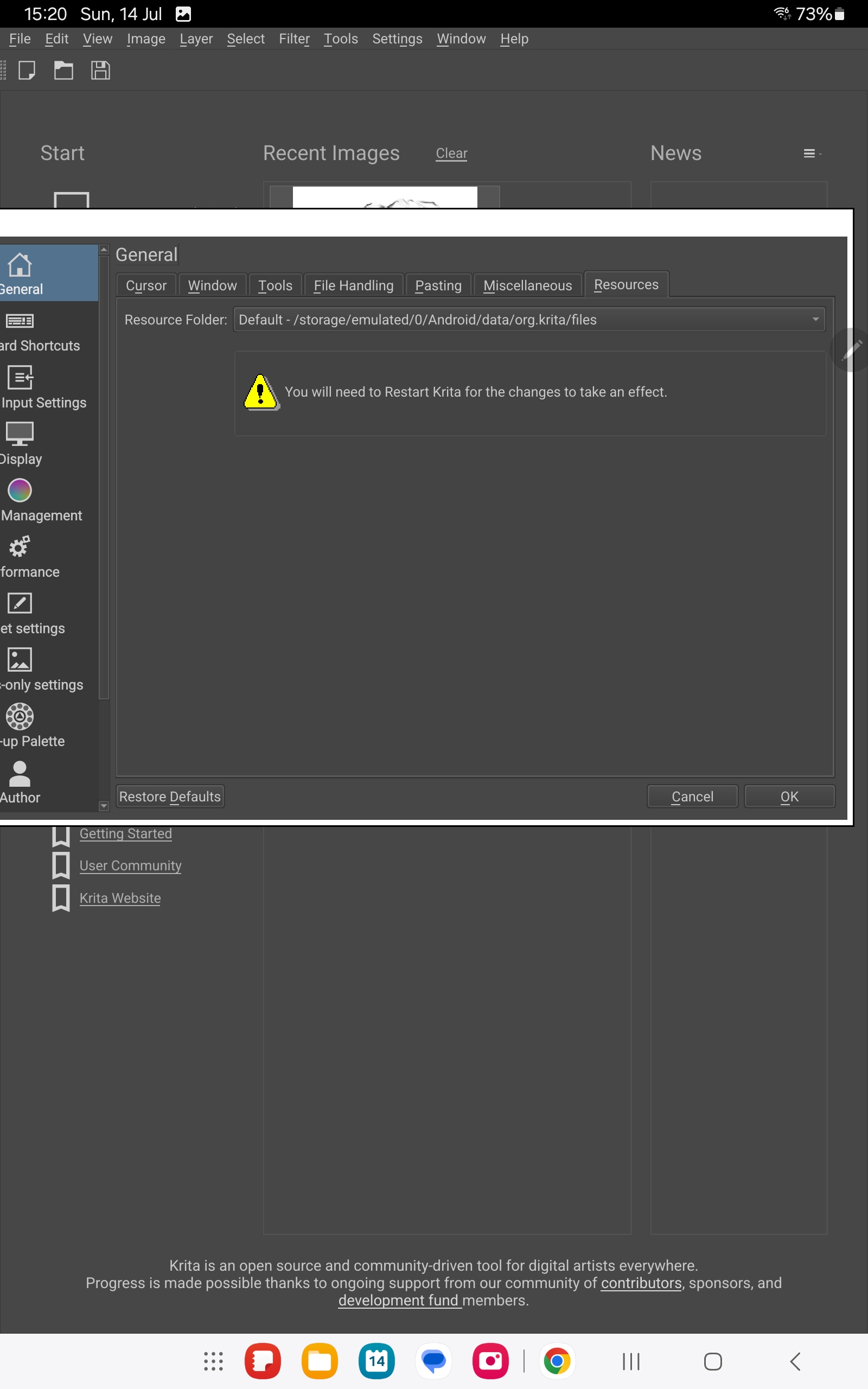 In your folder /storage/emulated/0/Android/data/org.krita/files there should be a file resourcecache.sqlite, how large is this file? And do not delete it!