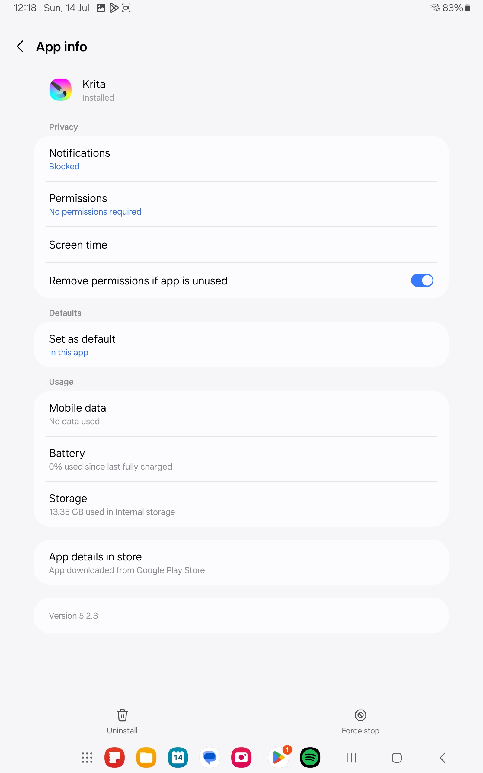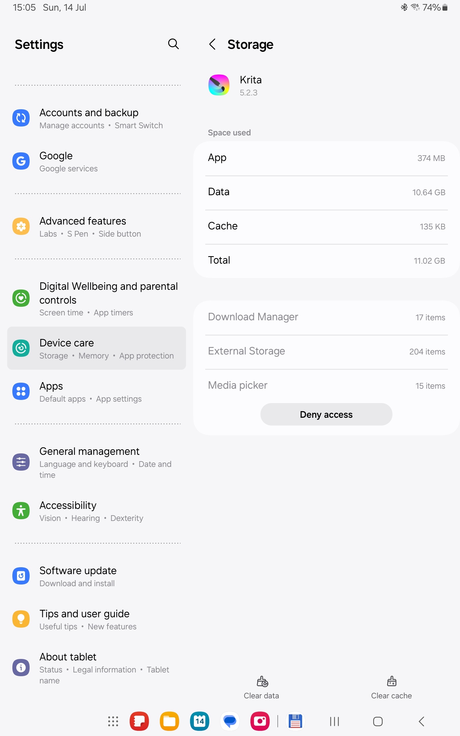 I backedup the brush bundles and other resources then deleted the app data, from the apps section in the tablet’s settings, and then I reimported the brush bundles that I know I’ll use the most and the app size was then at 533 MB. And yup, it got a bit bigger when I imported more brush bundles. This was on Krita 5.1.1.