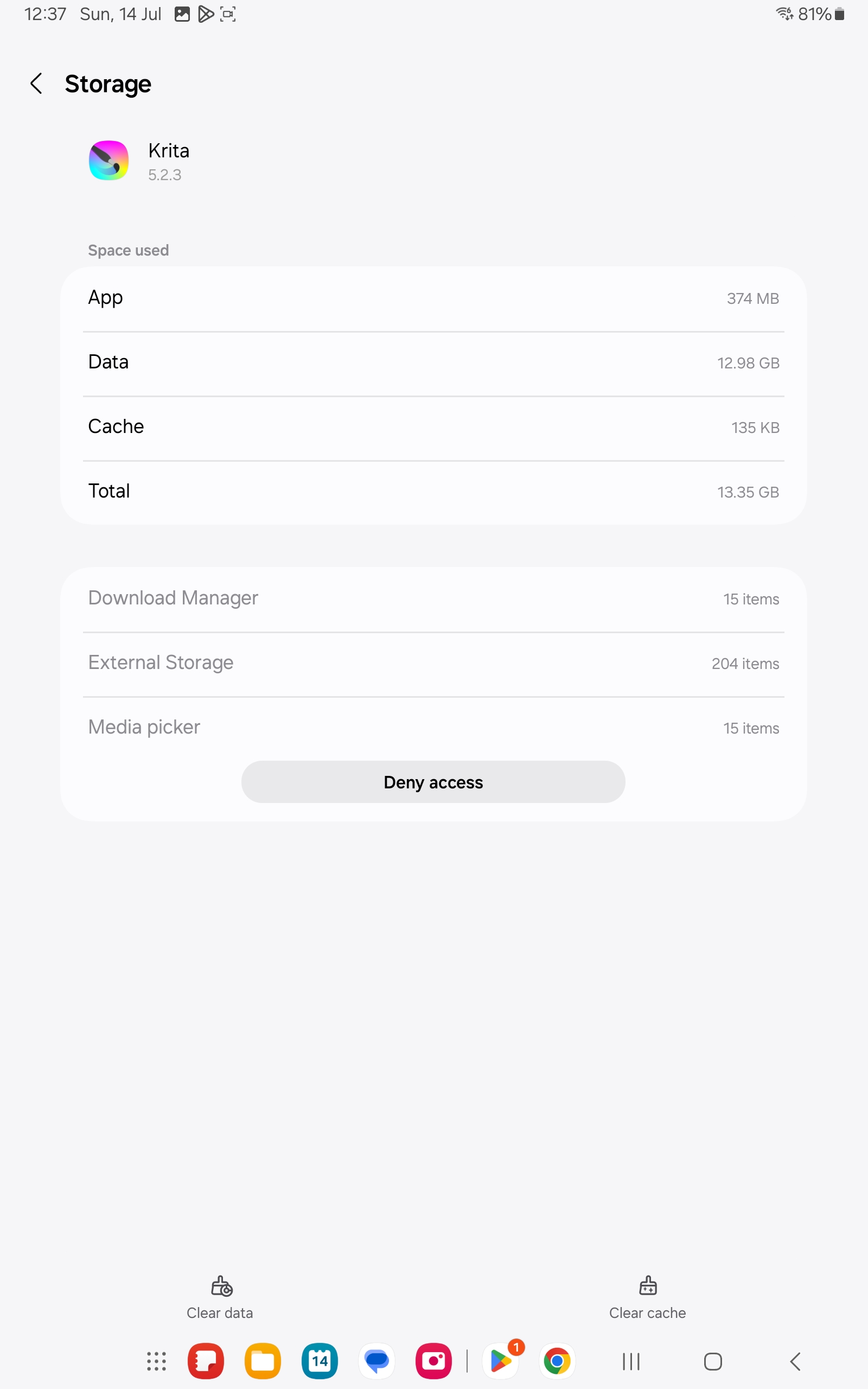 Here, I provide some screenshots of what I can find. I can easily clear the 12GB of data by just clicking “clear data” in the storage settings, but I worry that all my brushes will be gone