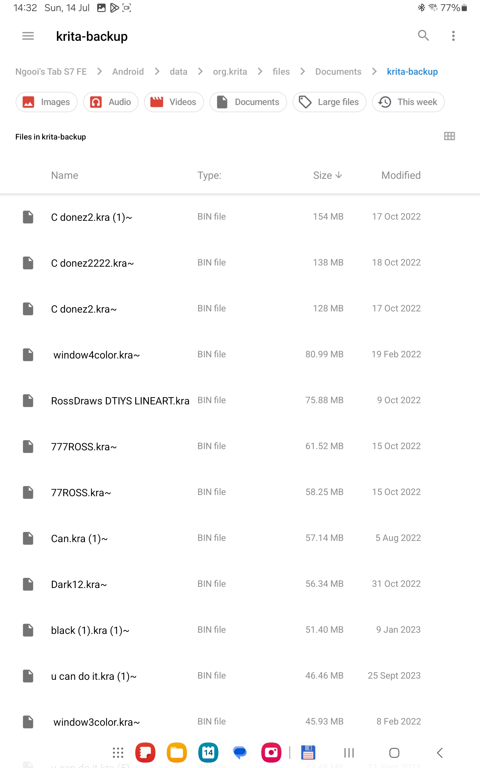 That is still huge. Can you go into Configure Krita, General, File Handling and see where your backups are being stored? I haven’t tried this myself, but you could try to search for all .kra and .kra~ files using Total Commander or Google Files.