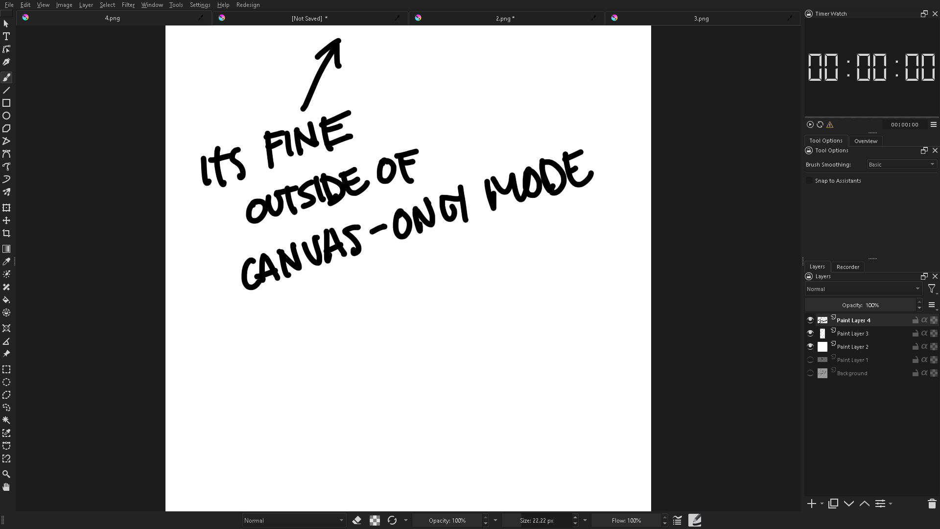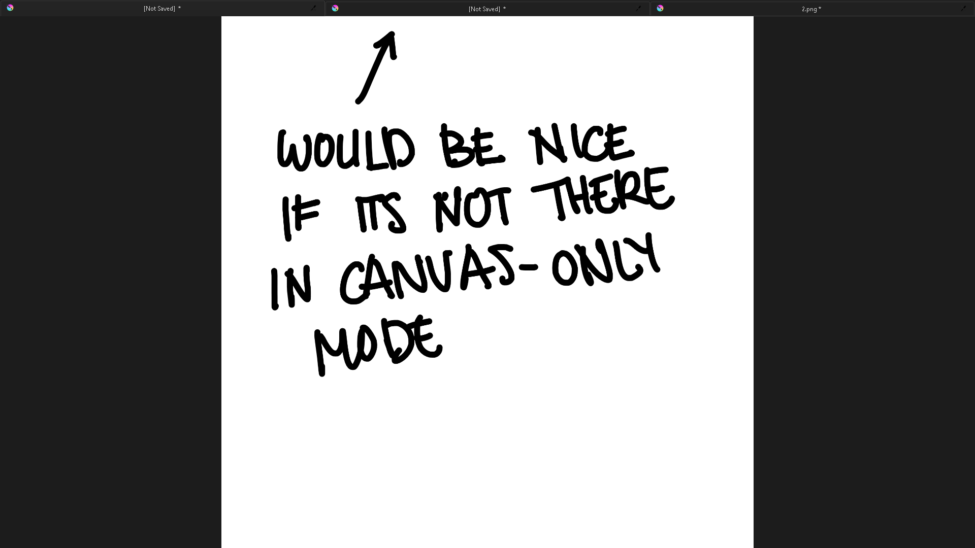 Another idea is when krita’s multiple document is set to Tabs. I think it would be nice if the tabs were hidden if you go into canvas-only mode. Like on subwindows mode. So i would just be able to see the tabs only outside of canvas-only mode.