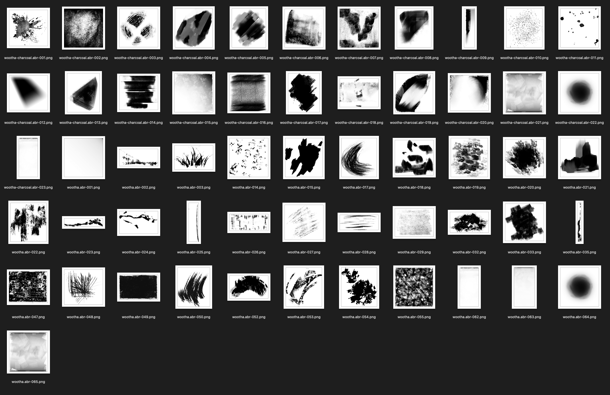 Wootha released his Photoshop brushes into the PUBLIC DOMAIN and people are free to do whatever they want with it. The brushes are in two .ABR files with one .TPL. A total of 684.8MB. Unfortunately, I don’t have access to Photoshop to extract all the brush tips. I took what I could through GIMP for my own use, but also making them available for those that want to add them to their collection. The tips are in PNG, highly compressed, no quality is lost.