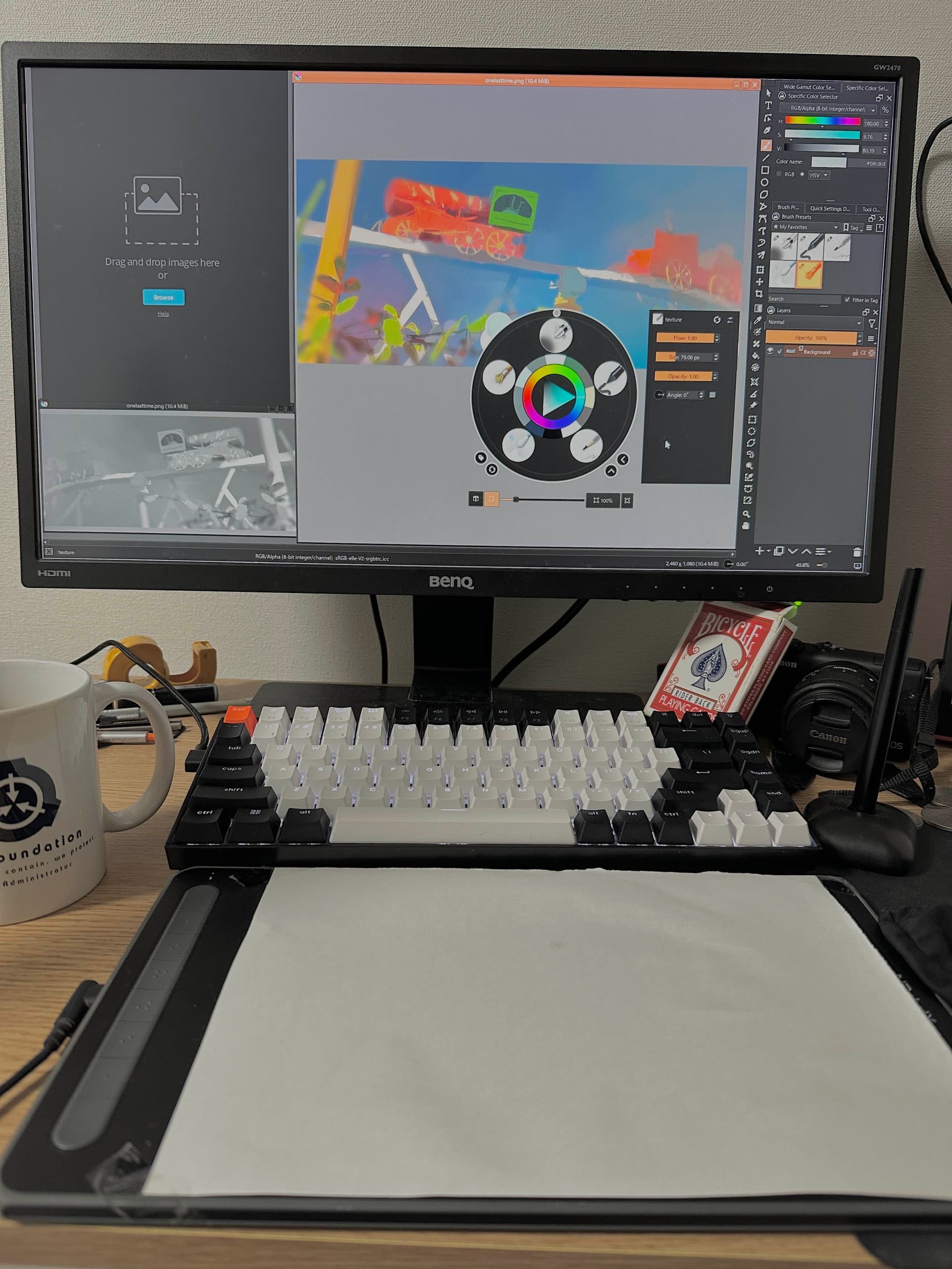 Not sure if this is the right place to put this but here goes. A question more of interest than help. I use krita on a huion kamvas 22 and am very new to digital drawing. I am left handed so rearranged my huion to the left side a few weeks ago which seems to work better but I am interested in how others have their work/hobby stations set up, especially those with loads of experience, would love to see soe photos of people’s setups. Thanks in advance